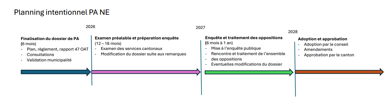 Le Comité rencontre, à sa demande, le municipal responsable de l’urbanisme et de la mobilité, ainsi que les représentants de la direction de l’urbanisme. Le Comité avait pour but de se faire préciser le planning d’intention du plan d’affectation Nord-est et de faire part des préoccupations fiscales pouvant en découler. Il ressort de cette séance que les convictions municipales découlant du plan directeur et des ateliers seront pleinement traduites dans le projet. L’APCV devrait être sollicitée lors de la sortie de la première version du plan d’affectation prévue pour la fin de l’année 2025. Le planning a été précisé et figure tel que distribué en séance ci-dessous :